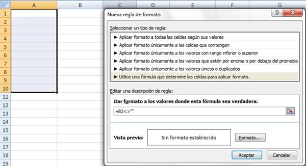 Lo que necesito es que si en B2 pongo dato este me coloree A1 (sin tener que poner fórmula o en cualquiera de las 3 celdas)