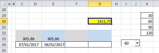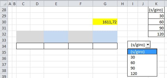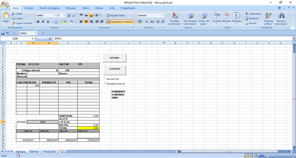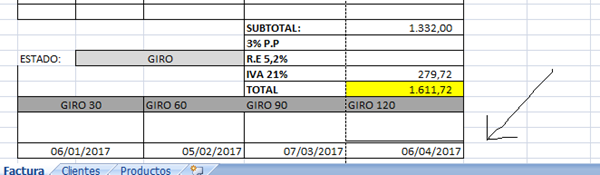 y sus usuarios) he podido avanzar mi plantilla de facturación a falta de una simple cosa.He avanzado la factura y lo que me falta es crear una función de giros (Dividir el importe total de la factura) en en 30,60,90 y 120 días lo cual se correspondería con dividirlo entre 1 para el primero entre dos pagos el de 60,3 el de 90 y 4 el de 120. Lo ideal seria que mediante una casilla de verificación para cada tipo de los cuatro al pulsar me situara automáticamente en la casilla el importe correspondiente y en la casilla de abajo ya habilitada la fecha =Hoy()+ 30,60,90 o 120 dependiendo del caso.El resutado sería que debajo de cada importe aparecería la fecha en la que se debiera pagar,sólamente si pulsara la casilla de verificación es decir si pulso la de 30 solo esa fecha y si pulso la de 120 las cuatro.Me hacen un favor enorme si pueden ayudarme.Muchisimas gracias.