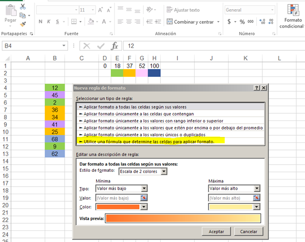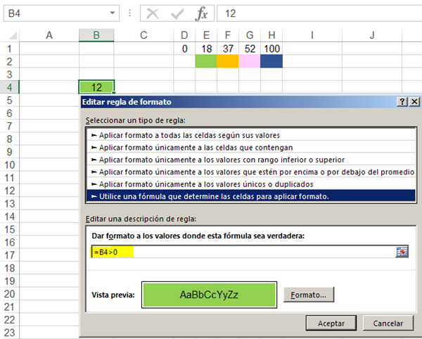 Como notarás, esa fórmula que coloqué en la casilla (en amarillo) evalúa el color a asignar cuando el contenido de la celda supere el "piso" para ese color.
