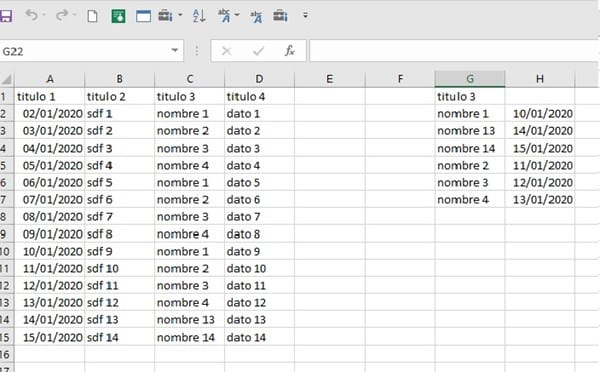 En la imagen puedes ver el resultado de mi macro, esta busca primero ordena los datos por titulo3 o columna 3, luego hace una copia de la columna 3 y le quita los repetidos para después buscar la fecha más reciente de cada uno y volviendo a ordenar la tabla por fecha ascendente para dejarla igual