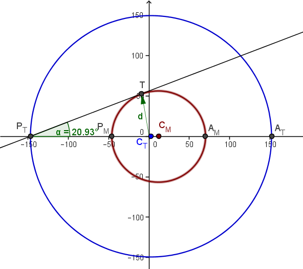 $$\begin{align}&\frac{(x-11.965)^2}{57.905^2}+\frac{y^2}{56.655^2}=1\\ &\\ &\frac{(-149.6+t -11.965)^2}{57.905^2}+\frac{t^2p^2}{56.655^2}=1\\ &\\ &56.655^2(t-161.565)^2+57.905^2t^2p^2 = 56.655^2·57.905^2\\ &\\ &t^2(56.655^2+57.905^2p^2)-t(323.13·56.655^2)+56.655^2(161.565^2-57.905^2)=0\\ &\\ &\text{Debe ser 0 el discriminante}\\ &(323.13·56.655^2)^2-4(56.655^2+57.905^2p^2)56.655^2(161.565^2-57.905^2)=0\\ &\\ &323.13^2·56.655^2-4(56.655^2+57.905^2p^2)(161.565^2-57.905^2)=0\\ &\\ &335143691.5 - (12839.1561+ 13411.9561p^2)22750.2602=0\\ &\\ &335143691.5-292094142 = 305125491.1p^2\\ &\\ &p=\sqrt{\frac{43049549.5}{305125491.1}}=0.3756168444\end{align}$$
