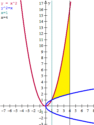 También podría haber sido y=-sqrt(x) pero por la gráfica se ve que la rama de la curva y^2=x que limita el área es la de signo positivo