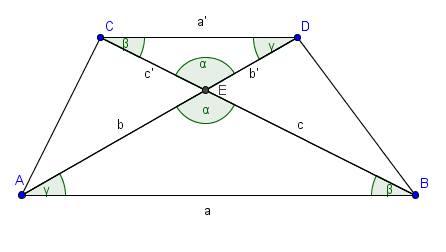 Por ser los triángulos ABE y DCE opuestos por el vértice E con los lados opuestos AB y DC paralelos son triángulos semejantes. En el dibujo están marcados los ángulos congruentes con la misma letra griega y los lados correspondientes con la misma letra y una prima en los lados de DCE.