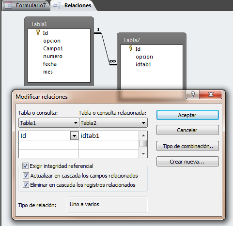Ahora bien se tienen que crear la relaciones de estas dos tablas, para ello ve a la barra de herramientas y busca el botón de "relaciones" ahí te solicitará que agregues las dos tablas, una vez hecho lo anterior selecciona el ID de la tabla de Cuenta y arrástralo al ID_Cuenta de la otra tabla, te aparecerá la ventana de modificar relación ahí dale verdadero a todas las opciones algo así