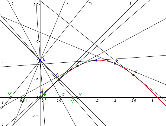 Trace la tangente por cada uno y luego la perpendicular pasando por (0,1) y luego el corte de esa perperdicular con el eje X dándome los puntos A', B', C', ...