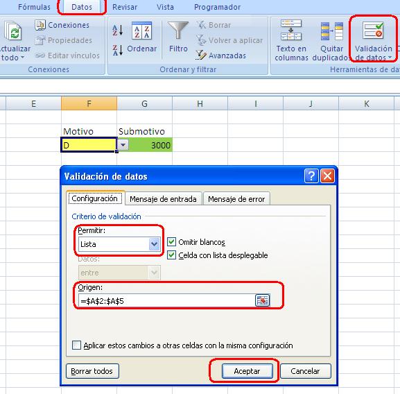 Los datos que aparecen en la columna A, son para cargar la lista de motivos.