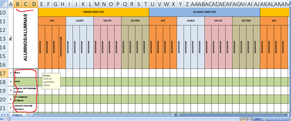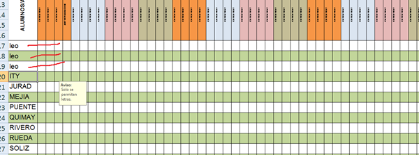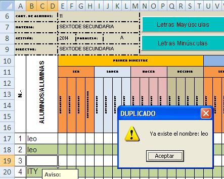 Ose, cuando quiero meter un nombre nuevo alumno me tire un error en la celda que no se puede introducir al alumno, por que tiene el mismo nombre y apellido.. en las celtas (BCD) en todas las celdas de la hoja...