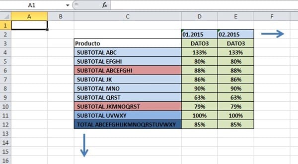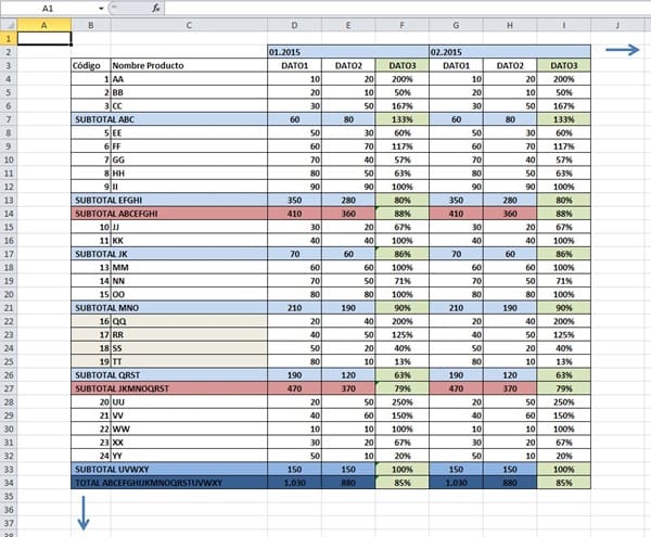 Las celdas no están combinadas y los nombres de los subtotales y totales están siempre en la columna B.