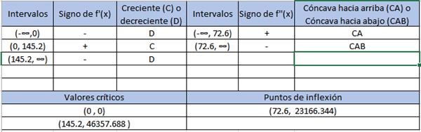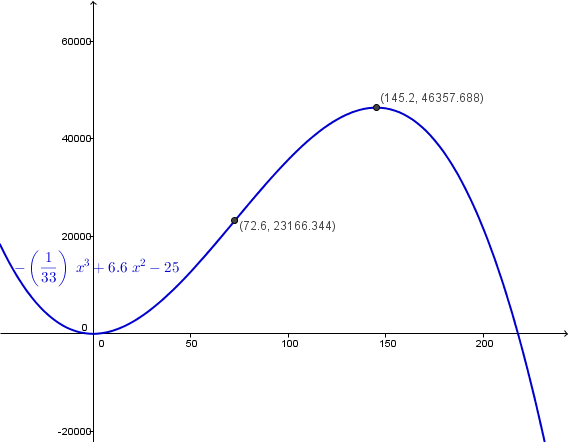 $$\begin{align}&f(x)= -\frac 1{33}x^3+6.6x^2-25\\&\\&f'(x)=-\frac 1{11}x^2+13.2x\\&\\&f''(x) =-\frac 2{11}x+13.2\\&\\&\text{Los valores críticos son:}\\&\\&-\frac 1{11}x^2+13.2x=0\\&\\&x_1=0\\&\\&-\frac{x}{11}+13.2=0\\&\\&x_2=11·13.2= 145.2\\&\\&\\&\text{Y la raíz de }f''(x) \\&\\&-\frac 2{11}x+13.2=0\\&\\&x_3=\frac{13.2·11}{2}=72.6\end{align}$$Los signos los calculo de esta forma f'(x) es polinomio de grado 2 con coeficiente director negativo.  Entonces en -infinito el límite es - infinito, luego el signo es negativo, luego pasa a positivo tras la primera raíz ya negativo tras la segunda.