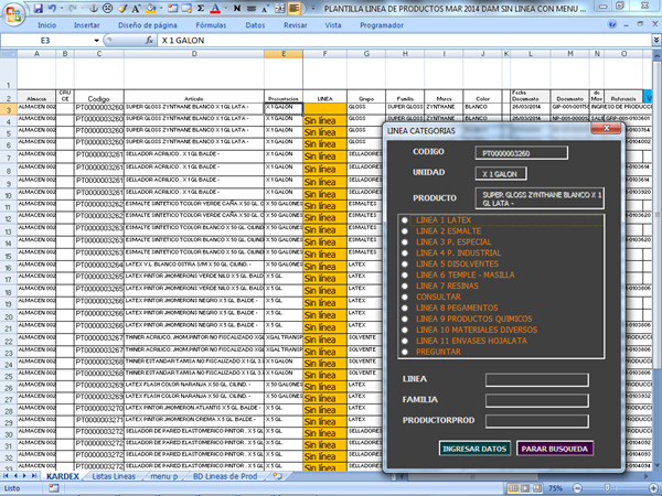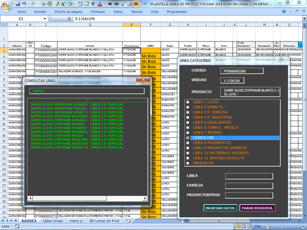 Paso 4. Menu "CONSULTA SENSITIVA POR LINEA".- Esta consulta la realizo en el caso yo desconozca a que linea pertenezca el producto que tengo que asignar, dando clip a la opcion "CONSULTA", como se ve en la imagen. Cabe recalcar que los datos que aparecen en este menu de CONSULTA estan en el libro "Listas Lineas" del archivo "LISTAS DE PRODUCCION.xls"