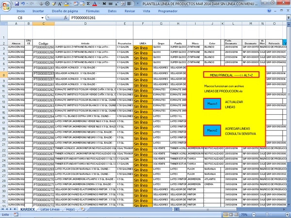 Paso 2.- MACRO 1 "Actualizar Lineas", al ejecutar esta macro quedo en el KARDEX varias filas con la palabra "SIN LINEA", es decir que dichos codigos aun no tienen Linea de Produccion asignada, tendremos que ejecutar la MACRO 2.