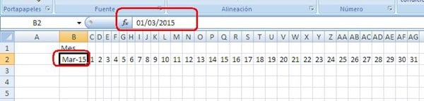 Pon una fecha en la celda "B2" que corresponda al mes "X", cambia el formato de la celda para que solamente se vea solamente el mes y el año, por ejemplo, yo puse la fecha 01/03/2015 (uno de marzo de 2015), pero en el formato solamente se ve el mes y el año, incluso, si no quieres que se vea el año, cambia el formato a "mmmm"