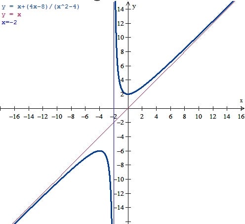 $$\begin{align}&y = x+\frac{4x-8}{x^2-4}=\\&\\&x+\frac{4(x-2)}{(x+2)(x-2)}\\&\\&y = x + \frac{4}{x+2}\end{align}$$Y así va a ser todo mucho más sencillo. De momento ha desaparecido la asíntota vertical en x=2, solo la hay en -2