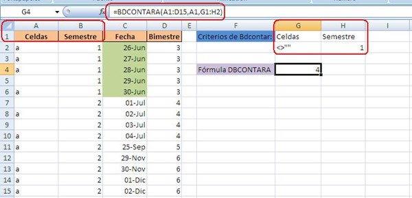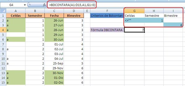 Entonces ahora vamos a ampliar la fórmula BDCONTARA, para que cuente las celdas que son diferente de blanco y que pertenecen al semestre 1.