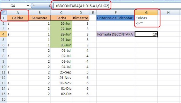 La fórmula está en la celda G4. Significa que va a leer los datos de las celdas A1 a D15, va a tomar el criterio del campo A1 ("Celdas") y que los criterios están en la celdas G1 a G2. El resultado son 10 de la columna "Celda" que no están en blanco.
