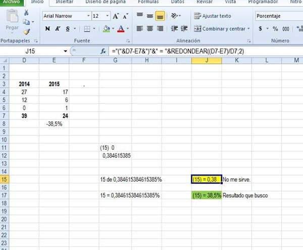 Tenga esta formula: ="("&D7-E7&")"&" = "&REDONDEAR((D7-E7)/D7;2), la cual me arroja como resultado =(15) = 0,38, pero esta no me sirve, ya que el porcentaje es -38,5.