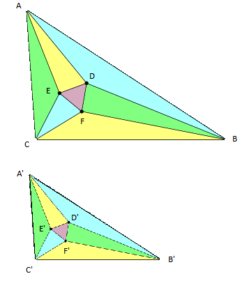 Y también la tercera parte del ángulo en C es igual a la tercera parte del ángulo en C', y se deduce que los triángulos ACE y A'C'E' son semejantes.