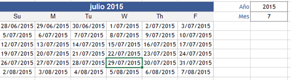 Estoy calculando días de vacaciones con un calendario a base de formulas que funciona bien, el calendario tiene los 7 días de la semana, el sábado esta oculto, pero ahí esta, las columnas de domingo a sábado son de la columna L a la columna R y en las filas partiendo del día es de la fila 4 a la fila 10.