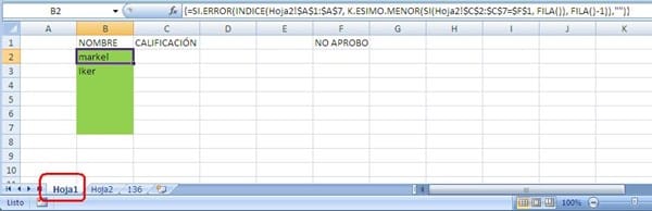 Para la calificación, pon en la celda C2, la siguiente fórmula matricial