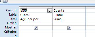 4º/ El último paso sería hacer una consulta de totales sobre CAuxTotal, seleccionando los campos Prod y Cuenta y totalizándolos por "Agrupar por" y "Suma" respectivamente: