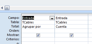 1º/ Creas una consulta sobre la tabla cables, y seleccionas el campo entradas dos veces, en dos columnas distintas. Conviertes la consulta en una consulta de totales, y la primera columna la totalizas por "Agrupar por" y la segunda por "Cuenta", así: