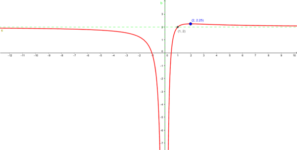 $$\begin{align}&y=\frac{1}{x}-\frac{1}{x^2}+2=\frac{x-1+2x^2}{x^2}\\&\\&Dom =\mathbb R-\{0\}\\&\\&\lim_{x\to 0}\frac{x-1+2x^2}{x^2}=\frac{-1}{0}=\infty\\&Asintota \ Vertical \ \ x=0 \ \ (eje Y)\\&\\&\lim_{x\to + \infty}\frac{x-1+2x^2}{x^2}=\lim_{x\to \infty}\frac{2x^2}{x^2}=2\\&\\&\lim_{x\to - \infty}\frac{x-1+2x^2}{x^2}=\lim_{x\to - \infty}\frac{2x^2}{x^2}=2\\&Asíntota \ Horizontal\ y=2\\&\\&crecimiento:\\&\\&y'=\frac{(4x+1)x^2-(2x^2+x-1)(2x)}{x^4}=\\&\\&simplificando \ una \ x\\&\\&=\frac{(4x+1)x-(2x^2+x-1)(2)}{x^3}=\frac{4x^2+x-4x^2-2x+2}{x^3}=\\&\\&=\frac{2-x}{x^3}\\&\\&puntos \ críticos \ \Rightarrow y'=0\\&\\&\frac{2-x}{x^3}=0\\&\\&2-x=0\\&\\&x=2\\&\\&Intervalos \ crecimiento:\\&\\&(-\infty,0) \Longrightarrow y(-10)'=\frac{2-(-10)}{(-10)^3}=\frac{+}{-}=- \Rightarrow \ Decreciente\\&\\&(0,2) \Longrightarrow y(1)'=\frac{2-1}{1}=+ \Rightarrow creciente\\&\\&(2,+\infty) \Longrightarrow y(10)'=\frac{2-10}{10^3}=\frac{-}{+}=- \Rightarrow \ Decreciente\\&\\&\\&\Longrightarrow x=2 \ es \ Máximo \ relativo\\&\\&f(2)=\frac{2(2)^2+2-1}{2^2}=\frac{9}{4}=2.25\\&Maximo (2,\frac{9}{4})\\&\\&\\&\end{align}$$