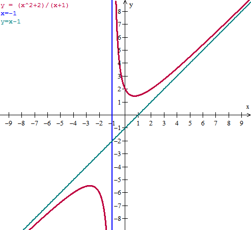 $$\begin{align}&m=\lim_{x\to\pm \infty}\frac{f(x)}{x}=\lim_{x\to\pm \infty}\frac{\frac{x^2+2}{x+1}}{x}=\lim_{x\to\pm \infty}\frac{x^2+2}{x^2+x}=1\\&\\&b=\lim_{x\to\pm\infty}(f(x)-x)=\lim_{x\to\pm\infty}\frac{x^2+2}{x+1}-x=\\&\\&\lim_{x\to\pm\infty}\frac{x^2+2-x^2-x}{x+1}=\lim_{x\to\pm\infty}\frac{2-x}{x+1}=-1\\&\\&\text{Luego la asíntota oblicua es:}\\&\\&y=x-1\end{align}$$
