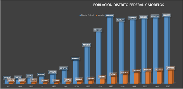 Yo no sé qué quieren que contestemos exactamente, eso a lo mejor te lo pone o lo puedes deducir de la teoría que estes estudiando o de otro ejercicio similar que hayáis hecho. Yo diría que el crecimiento de Morelos ha sido más o menos constante siempre hacia arriba, mientras que el del Distrito Federal fue muy grande hasta 1980 y luego bajó y después volvió a subir pero muy lento, na da que ver con el crecimiento anterior.