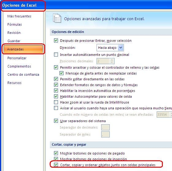 2. Revisa en las opciones de excel, Avanzadas, esté activa la casilla de Cortar, copiar y ordenar objetos junto con las celdas: