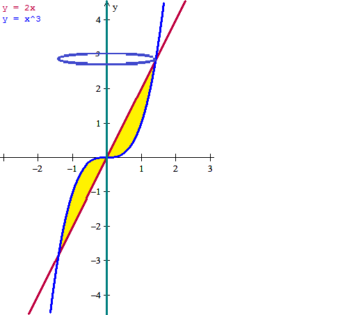 $$\begin{align}&V=\pi\int_{y_1}^{y_2}f(y)^2 dy\\&\\&\text{Si son dos funciones, al volumen exterior}\\&\text{hay que restar el interior}\\&\text{Y como calculamos solo el de arriba}\\&\text{multiplicaremos por 2}\\&\\&V=2\pi\int_0^{2 \sqrt 2}\left(\left(y^{\frac 13}\right)^2-\left(\frac y2 \right)^2\right)dy=\\&\\&2\pi\int_0^{2 \sqrt 2}\left(y^{\frac 23}-\frac {y^2}{4}\right)dy=\\&\\&2\pi \left[\frac 35 y^{\frac 53}-\frac{y^3}{12} \right]_0^{2 \sqrt 2}=\\&\\&2\pi \left(\frac 35(2 \sqrt 2)^{\frac 53}-\frac{(2 \sqrt 2)^3}{12} \right)=\\&\\&2\pi\left(\frac 35 (128 \sqrt 2)^{\frac 13}-\frac{16 \sqrt 2}{12} \right)=\\&\\&2\pi\left(\frac 35·2^2·2^{1/3}·2^{1/6}-\frac 43 \sqrt 2 \right)=\\&\\&2\pi\left(\frac 35·4 \sqrt 2-\frac 43 \sqrt 2 \right)=\\&\\&2 \sqrt 2\pi \left(\frac {12}5-\frac 43 \right)=\\&\\&2 \sqrt 2\pi·\frac {16}{15}=\frac{32 \sqrt 2 \,\pi}{15}\\&\end{align}$$