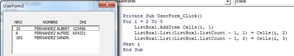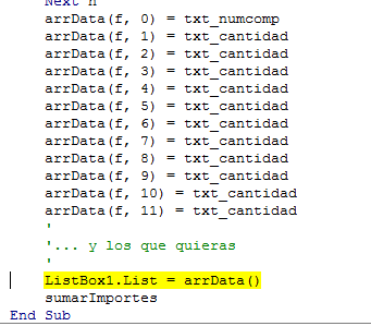 Dim i As Long Private Sub CommandButton8_Click() Dim arrData() As String With ListBox1 .ColumnCount = 12 'numero de columnas .ColumnWidths = "40 pt;40 pt;40 pt;40 pt;40 pt; " & _ "40 pt;40 pt;40 pt;40 pt;40 pt; " & _ "40 pt;40 pt" End With f = ListBox1.ListCount j = ListBox1.ColumnCount ReDim arrData(f, j) For n = 0 To j For m = 0 To f - 1 'dato = ListBox1.List(m, n) arrData(m, n) = ListBox1.List(m, n) Next m Next n arrData(f, 0) = txt_numcomp arrData(f, 1) = txt_cantidad arrData(f, 2) = txt_cantidad arrData(f, 3) = txt_cantidad arrData(f, 4) = txt_cantidad arrData(f, 5) = txt_cantidad arrData(f, 6) = txt_cantidad arrData(f, 7) = txt_cantidad arrData(f, 8) = txt_cantidad arrData(f, 9) = txt_cantidad arrData(f, 10) = txt_cantidad arrData(f, 11) = txt_cantidad ' '... y los que quieras ' ListBox1.List = arrData() sumarImportes End Sub