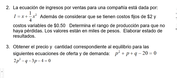 I= x + 1/4 x2 Además de considerar que se tienen costos fijos de $2 y costos variables de $0.50. Determina el rango de producción para que no haya pérdidas. Los valores están en miles de pesos. Elaborar Estado de Resultados.