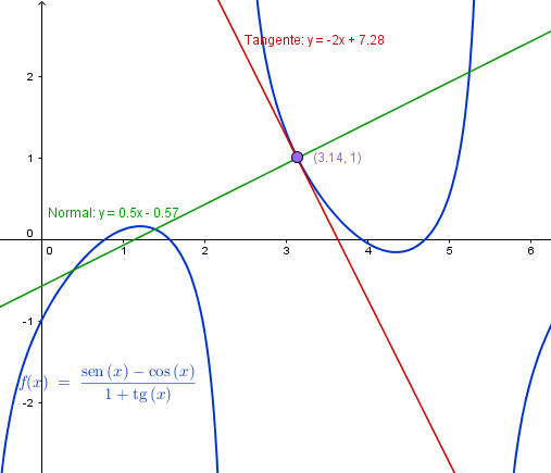 $$\begin{align}&y=y_0+f'(x_0)(x-x_0)\\&\\&y=y_0-\frac{1}{f'(x_0)}(x-x_0)\\&\\&\text{como puedes ver son muy similares, debemos}\\&\text {calcular }y_o \text{ y } f'(x_0)\\&\\&y_0=f(x_0)=\frac{sen\pi-\cos \pi}{1+tg \,\pi}= \frac{0-(-1)}{1+0}=1\\&\\&f'(x)=\frac{(cosx+senx)(1+ tg\,x)-(senx-cosx)(1+tg^2x)}{(1+tg\,x)^2}\\&\\&\text{no merece la penasimpñlificarla}\\&\\&f'(\pi) = \frac{(-1+0)(1+0)-(0+1)(1+0)}{(1+0)^2}=\frac{-1-1}{1}=-2\\&\\&\text{la recta tangente será}\\&\\&y=1-2(x-\pi)= -2x+1+2\pi\\&\\&\text{Y la normal}\\&\\&y=1 +\frac 12(x-\pi)= \frac 12x+1 - \frac \pi 2\\&\end{align}$$Vamos a verificarlo todo.