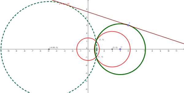 $$\begin{align}&x^2+y^2-6x+4=0\\&x^2+y^2-2=0\\&\\&restándolas:\\&-6x+6=0\\&x=1\\&sustituyendo \ en \ la \ segunda:\\&1+y^2-2=0\\&y^2=1\\&y=\pm1\\&\\&puntos \ intersección:\\&(1,1)\\&(1,-1)\\&el \ centro \ de \ la \ circunferencia \ buscada \ equidista \ de \ esos \dos \ puntos,\ luego\\&está \ en \ su \ mediatriz que \es \ el\ eje \ x.Luego centro \ es\\&D=(d,0)\\&radio=distancia(D,t)\\&t:recta \ tangente:x+3y-14=0\\&\\&r=\frac{|Ax+By+C|}{\sqrt{A^2+B^2}}=\frac{|d-14|}{\sqrt{3^2+1^2}}=\frac{|d-14|}{\sqrt{10}}\\&\\&ecuación \ circunferencia \ buscada:\\&(x-d)^2+y^2=\Big(\frac{|d-14|}{\sqrt{10}} \Big)^2\\&(x-d)^2+y^2=\frac{d^2-28d+196}{10}\\&\\&el \ punto \ (1,1) \ pasa \ por \ esa\ circunferencia:\\&\\&(1-d)^2+1=\frac{d^2-28d+196}{10}\\&\\&\\&(1-2d+d^2+1)10=d^2-28d+196\\&\\&9d^2+8d-176=0\\&\Rightarrow\\&d_1=4 \Rightarrow r_1=\frac{|4-14|}{\sqrt {10}}=\frac{10}{\sqrt{10}}=\sqrt {10} \Rightarrow(x-4)^2+y^2=10\\&\\&solución2:\\&d_2=\frac{-44}{9} \Rightarrow r_2=\frac{|-\frac{44}{9}-14|}{\sqrt{10}}=\frac{170}{9 \sqrt{10}} \Rightarrow \\&\\&(x+\frac{44}{9})^2+y^2=(\frac{170}{9 \sqrt{10}})^2=\frac{2890}{81}\end{align}$$