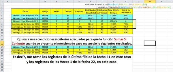 Esta función suma en I (Distribución de Tiempo), las cantidades de tiempos medidos en minutos que aparece en F (Tiempo), si se cumplen las siguientes condiciones: