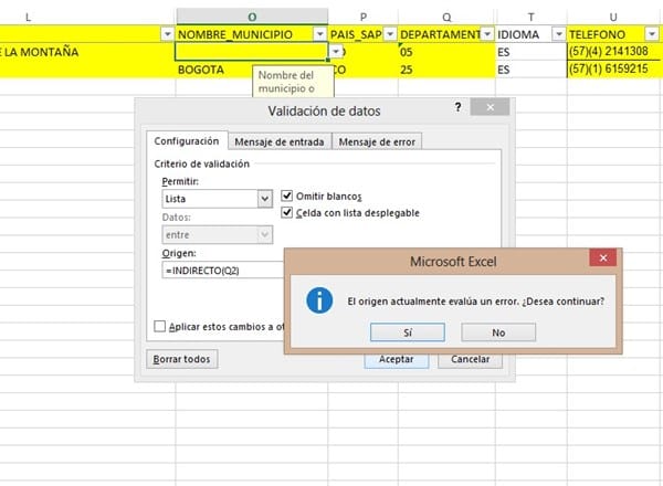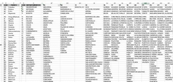Hola Dante hace un tiempo me ayudaste con una macro para este archivo, este cuenta con una Lista desplegable de Países (P) y por ahora solo tiene los departamentos (Q) correspondientes a Colombia (Digo por ahora por que seguro más adelante necesitare vincular a cada país sus departamentos/provincias o poblaciones) pero en este caso en particular lo que necesito es que al elegir un departamento me traiga todos los municipios o ciudades (O) pertenecientes a este específicamente, trate de hacerlo con una validación de datos de lista dependiente y me arroja error. Es de aclarar que los nombres de los no los puedo cambiar ya que este archivo se carga en otro software donde ya tiene los datos así y cualquier cambio bloquearía la carga