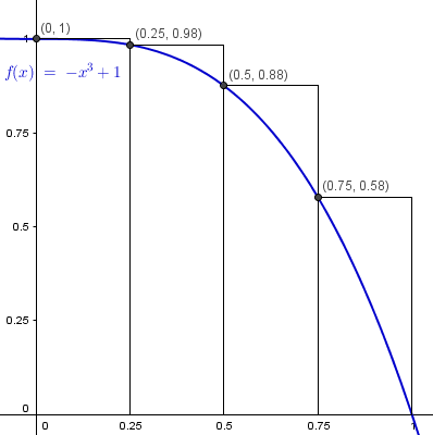$$\begin{align}&R(f,4)=f(x_0)(x_1-x_0)+f(x_1)(x_2-x_1)+f(x_2)(x_3-x_2)+f(x_3)(x_4-x_3)=\\&\\&\text {hacemos cálculos aparte}\\&\\&f(x_0)=f(0) = -0^3+1=1\\&f(x_1)= f\left(\frac 14 \right)=-\frac 1{64}+1=\frac{63}{64}\\&f(x_2)=f\left(\frac 12 \right)=-\frac{1}{8}+1=\frac 78\\&f(x_3) = f\left(\frac 34 \right)=-\frac{27}{64}+1=\frac{37}{64}\\&x_1-x_0=\frac 14\\&x_2-x_1=\frac 12 - \frac 14= \frac 14\\&x_3-x_2=\frac 34 - \frac 12 = \frac 14\\&x_4-x_3=1-\frac 34 = \frac 14\\&\\&\text{Luego la suma de Rieman es}\\&\\&= 1·\frac 14+\frac{63}{64}·\frac 14+\frac{7}{8}·\frac 14+\frac{37}{64}·\frac 14=\\&\\&\frac 14\left(1+\frac{63}{64}+\frac{7}{8}+\frac{37}{64} \right)=\\&\\&\frac 14·\frac{64+63+56+37}{64}= \frac 14·\frac{220}{64}=\frac{220}{256}=\frac{55}{64}\\&\\&\end{align}$$