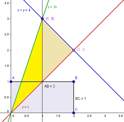 $$\begin{align}&A_1=\int_0^1(3x-x)dx=\int_0^12x\;dx=x^2\bigg|_0^1=1\\&\\&A_2=\int_1^2[(4-x)-x]dx=\int_1^2(4-2x)dx=\\&\\&\left[4x-x^2\right]_1^2= 8-4-4+1=1\\&\\&\text{Luego el área total es:}\\&\\&A=1+1=2\end{align}$$