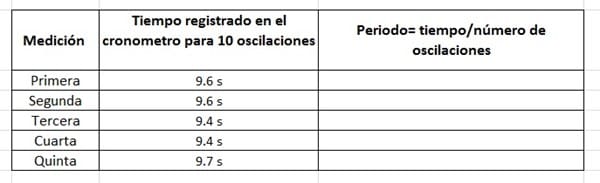 - Se repite la medida anterior un total de cinco veces con el mismo péndulo. Para poder sacar un promedio entre ellas y obtener un resultado más exacto.