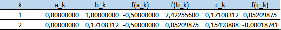 $$\begin{align}&c_k=\frac{f(b_k)a_k-f(a_k)·b_k}{f(b_k)-f(a_k)}\\&\\&\text{Si }c_k\text{es suficientemente pequeño ya está}\\&\\&\text{Si no, se toma como nuevos extremos } c_k \text{ y el valor }\\&a_k\; o\; b_k \text{ que tenga signo opuesto a }c_k\\&\text{Según sea eso puede darse}\\&[a_{k+1},b_{k+1}]=[a_k, c_k]\\&o\\&[a_{k+1},b_{k+1}]=[c_k,b_k]\\&\\&\text{Empezamos con }\\&a_1=0;b_1=1\\&\\&c_1= \frac{(3.2 sen1-0.5cos1)·0-(3.2sen0-0.5cos0)·1}{(3.2 sen1-0.5cos1)-(3.2sen0-0.5cos0)}=\\&\\&\frac{0.5}{2.922555998}=0.170831205\\&\\&Tenemos\\&f(a_1)=f(0)=-0.5\\&f(c_1)= f(0.170831205) = 0.05209875\gt0.001\\&f(b_1)=f(1)=2.42255600\\&\\&\\&\text{Para que haya signos distintos de la función se debe tomar}\\&[a_2,b_2]=[0, \;0.170831205]\\&\\&c_2= \frac{(3.2 sen0.170831205-0.5cos0.170831205)·0-(3.2sen0-0.5cos0)·1}{(3.2 sen0.170831205-0.5cos0.170831205)-(3.2sen0-0.5cos0)}=\\&\\&0.15493888\\&\\&Tenemos\\&f(a_2)=f(0)=-0.5\\&f(c_2)=f(0.15493888)=-0.00018741\\&|f(c_2)|=0.00018744 \lt 0.001\\&\\&\text{Entonces ya está}:\\&\\&x=0.15493888\end{align}$$
