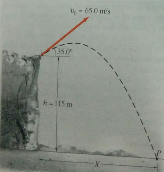 Se dispara un proyectil desde el borde de un acantilado que está a 115 m por encima del nivel del suelo, con una rapidez inicial de 65 m/s a un ángulo de 35° sobre la horizontal. A) Determine el tiempo que dura el proyectil en el aire. (En segundos)