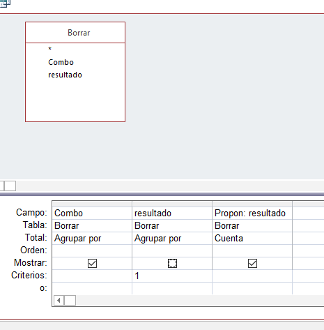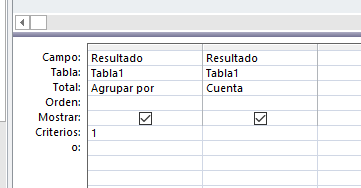 Busco el similar a COUNTIF de excel. Necesito contar los "Combo" en los que "Resultado"=1 en una consulta de access. He intentando utilizar dcount sin éxito.