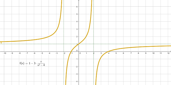$$\begin{align}&x^2-4=0\\&x= \pm2\\&\\&Domf(x)=\mathbb R- \{\pm2 \}\\&\\&Corte \ eje \OX ==> y=0=\\&\\&1- \frac {3x}{x^2-4}=0\\&\\&1=\frac {3x}{x^2-4}\\&\\&x^2-4=3x\\&x^2-3x-4=0\\&x_1=-1\\&x_2=4\\&\\&Corte \ Eje\ OY==> x=0==> f(0)=1-0=1\\&(0,1)\\&\\&Simetría:\\&f(-x)=1+ \frac{3x}{x^2-4} \neq f(x) ==> NO \ Par\\&\\&-f(x)=-1+ \frac {3x}{x^2-4} \neq f(-x) ==> No \ Impar\\&\\&2.-)\\&Asíntotas \ Horizontales\\&\lim_{x \to + \infty}1- \frac {3x}{x^2-4}=1-0=1\\&\\&\lim_{x \to - \infty}1- \frac {3x}{x^2-4}=1-0=1\\&Asint. Horiz.\\&y=1\\&\\&Asíntotas \Verticales\\& \lim_{x \to \pm 2}1- \frac {3x}{x^2-4}=1-\frac 6 0=1 \mp \infty=\mp \infty\\&\\&Asíntotas\Verticales\\&x=2\\&x=-2\\&\\&\lim_{x \to -2^-}(1- \frac {3x}{x^2-4})=1+\frac 6 {+0}= +\infty\\&tambien \ puedes \ calcular\ f(-2,1) >0 (para \ visualizar \ el \ signo \ de \ ese \ infinito)\\&\\&\lim_{x \to -2^+}(1- \frac {3x}{x^2-4})=1+\frac 6 {-0}= -\infty\\&tambien \ puedes \ calcular\ f(-1,9) <0 (para \ visualizar \ el \ signo \ de \ ese \ infinito)\\&\\&\lim_{x \to 2^-}(1- \frac {3x}{x^2-4})=1-\frac 6 {-0}= +\infty\\&tambien \ puedes \ calcular\ f(1,9) >0 (para \ visualizar \ el \ signo \ de \ ese \ infinito)\\&\\&\lim_{x \to 2^+}(1- \frac {3x}{x^2-4})=1-\frac 6 {+0}= -\infty\\&tambien \ puedes \ calcular\ f(2,1) <0 (para \ visualizar \ el \ signo \ de \ ese \ infinito)\\&\\&3) Discontinuidades \ Asíntóticas\ en \\&x=2\\&x=-2\\&\\&4)\\&f'(x)=\frac {3x^2+12}{(x^2-4)^2}\\&extremos relativos==> f'(x)=0\\&\\&\frac {3x^2+12}{(x^2-4)^2}=0\\&\\&3x^2+12=0\\&\\&x^2=-4 ==>\not \exists \extremos\\&\\&intervalos \Crecimiento:\\&(-\infty,-2)==> f'(-10)>0 ==> creciente\\&\\&(-2,2)==> f'(0)>0 ==> creciente\\&\\&(2,+\infty))==> f'(10)>0==> creciente\\&\\&\end{align}$$