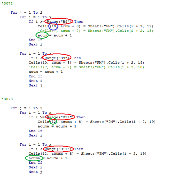 Este mismo paso lo repito 40 veces, lo unico que cambia es que el Rango(rojo) aumenta en la fila de 2 en 2 osea B9, B11, B13... Etc, el valor de la fila(azul) aumenta de 2 en 2 tambien, y le pongo una variable acum, acuma, acumb... Etc para que cuente desde 0, esto me demora demasiado, gracias por sus aportes. EL codigo esta mas abajo para que me puedan guiar, solo en esto es mi problema.