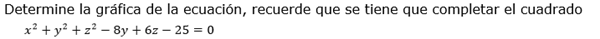 Determine la gráfica de la ecuación, recuerde que se tiene que completar el cuadrado x^2+y^2+z^2-8y+6z-25=0