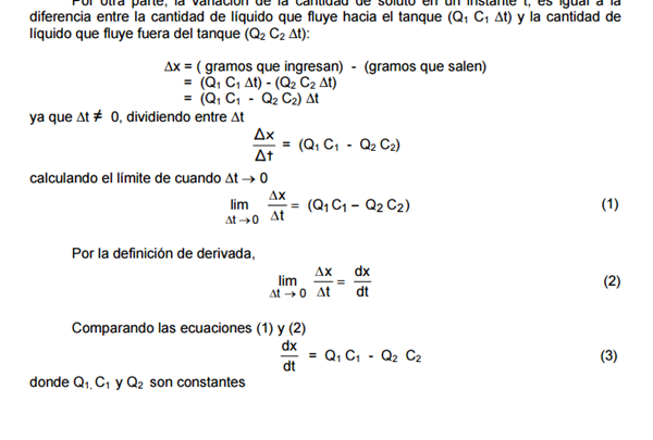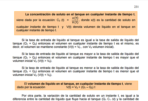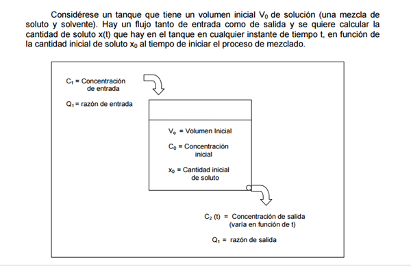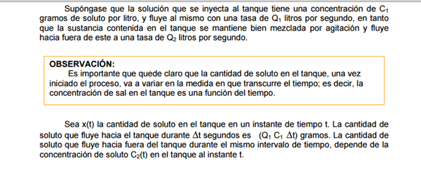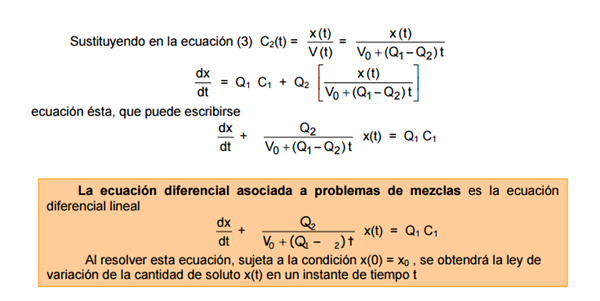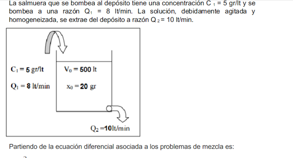 $$\begin{align}&\frac{dx}{dt}+ \frac {Q_2}{V_0+(Q_1-Q_2)t}x(t)=Q_1C_1\\&\\&\frac{dx}{dt}+ \frac {10}{500+(8-10)t}x(t)=8·5\\&\\&simplificando:\\&\\&\frac{dx}{dt}+ \frac {5}{250-t}x(t)=40\\&\\&despejando:\\&\frac{dx}{dt}=40-\frac {5}{250-t}x(t)\\&\\&dx+ \frac 5 {250-t}x dt=40dt\ \ (*)\\&Ecuación \ Diferencial\ Lineal\ de\ la \ forma\ :x'+F(t)x=G(t)\\&\\&donde\\&\\&F(t)=\frac 5 {250-t}x \ \ i\\&G(t)=40\\&Se\ integra\ \ con\ Factor\ Integrante \mu\\& \int F(t)dt=\int \frac 5{250-t}dt=-5ln|250-t|\\&\\&\mu=e^{-5ln|250-t|}=(250-t)^{-5}\\&\\&Multiplicando\ ED(*)\ por \mu\\&\\&(250-t)^{-5}dx+(250-t)^{-5} \frac 5 {250-t}x dt=40(250-t)^{-5}dt\\&\\&(250-t)^{-5}dx+5(250-t)^{-6} x dt=40(250-t)^{-5}dt\ \ (**)\\&Que \es \diferencial\exacta \ ya \que\\&\\&(250-t)^{-5}dx+5(250-t)^{-6} x dt=d\Big[(250-t)^{-5}x \Big]\\&\\&sustituyendo\ en \ (**)\\&d\Big[(250-t)^{-5}x \Big]=40(250-t)^{-5}dt\\&\\&Integrando:\\&\int d\Big[(250-t)^{-5}x \Big]=\int 40(250-t)^{-5}dt\\&inmediatas:\\&\\&(250-t)^{-5}x=\frac{40(250-t)^{-4}}{-4(-1)}\\&\\&(250-t)^{-5}x={10(250-t)^{-4}}+K\ \ (***)\\&K:constnte\integración.\ De\ la \ condición \ inicial \ t=0\==>x=20gr\\&\\&x(0)=20\\&sustituyendo\\&250^{-5}·20=10·250^{-4}+K\\&\\&K=\frac{20}{250^5}- \frac{10}{250^4}=\frac{20-2500}{250^5}=\frac{-2480}{250^5}=-(250^{-5})2480\\&\\&Este \ valor \ se \ sustituye\ en \ (***)\\&\\&(250-t)^{-5}x={10(250-t)^{-4}}-2480(250)^{-5}\\&\\&Multiplicandola\ por \ (250-t)^{5}:\\&\\&x= 10(250-t)-2480\Big(\frac{250-t}{250} \Big)^5\\&\\&Que\ es \ la \ ley \ de \ variación \ de \ gr \ de \ sal\ en\ el \ depósito\ en \ el\ instante\ t\\&\\&Finalmente\ la \ concentración:\\&\\&C(t)= \frac{x(t)}{V(t)}\\&\\&V(t)=V_0+(Q_1-Q_2)t=500-2t=2(250-t)\\&\\&Sustituyendo:\\&\\&C(t)=\frac{10(250-t)-2480\Big(\frac{250-t}{250} \Big)^5}{2(250-t)}=5-1240 \frac{(250-t)^4}{250^5}\\&\end{align}$$Repasa las cuentas.