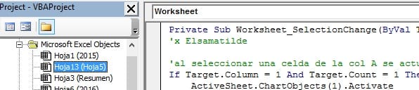 Entonces, entra al Editor, selecciona con doble clic el objeto HOJA (en mi caso es Hoja5) y allí se pega el código... al que tendrás que hacerle los ajustes según tu tabla de datos.