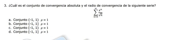 ¿Cuál es el conjunto de convergencia absoluta y el radio de convergencia de la siguiente serie?