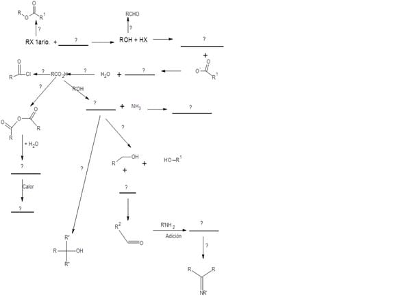 - A partir de la secuencia de reacciones, identificar los estructura generales de los compuestos que corresponden al signo de interrogación (bien sea reactivo o producto de reacción), identificando de igual manera el tipo de reacción e identificando el tipo de función orgánica o grupo funcional que interviene en la reacción. Actividad de desarrollo colaborativo.