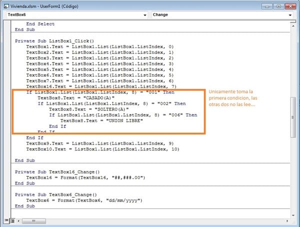 Tengo datos presentados en un Listbox de los cuales quiero presentar esos datos en varios textbox, de los cuales uno de ellos tiene 3 condiciones mismas que quiero controlar con "If" pero nada más entra a la primera condición y cuando encuentra un registro en el que debe leer la segunda condición se queda con el dato de la primera. Les agradecer muchísimo pudieran apoyarme generando el código correcto. Subo la pantalla de mi código.